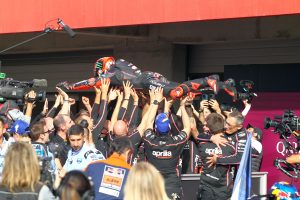 Na última volta, Márquez reagiu, minimizando os danos, mesmo que a diferença continuasse a diminuir. Uma corrida inspirada de Acosta significou que ele chegou perto, mas não o suficiente, numa história semelhante à de ontem, mas ninguém conseguiu alcançar Bezzecchi. Da largada à bandeira, o #72 dominou Portimão com uma vitória majestosa, tornando-se o sexto vencedor diferente em seis Grandes Prémios. Márquez e Acosta completaram o pódio atrás do piloto da Aprilia, que deu à fabricante italiana a terceira vitória em 2025, a primeira vez que eles conquistaram três vitórias em uma única temporada.